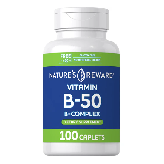 Complesso B-50 Nature’s Reward: supporta energia, mente, pelle e capelli. 100 compresse vegan, senza glutine né soia. Ideale per stress e stanchezza.