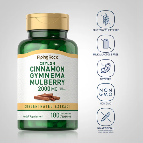 PipingRock 2000 mg per dose fornisce Cannella “vera” di Ceylon, Gymnema Sylvestre (nota nella tradizione ayurvedica come “distruttrice di zucchero”) e Gelso Bianco, racchiusi in capsule a rilascio rapido di facile deglutizione.
